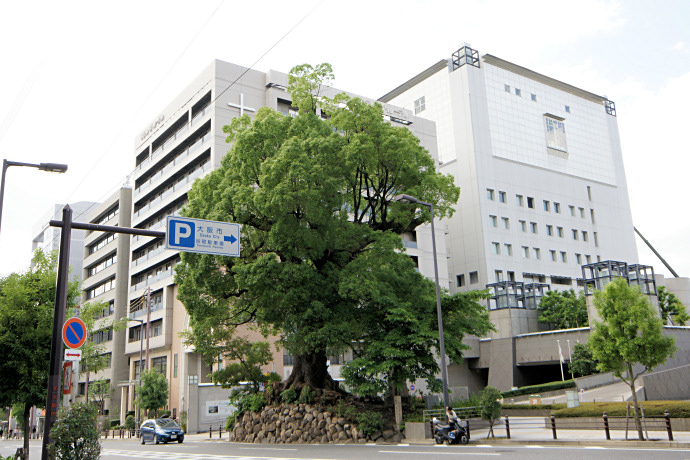 | ●データがありませんがだいたいの目安で、幹周/約5m、樹高/約20m。左後方がNHK大阪放送局。 |