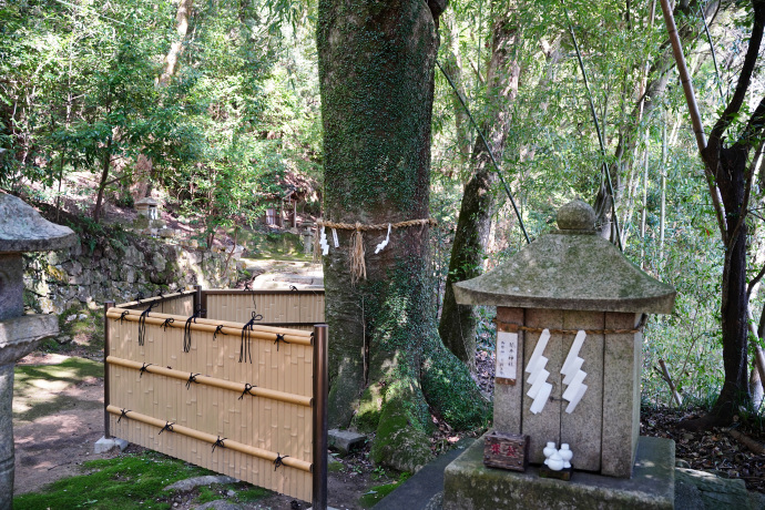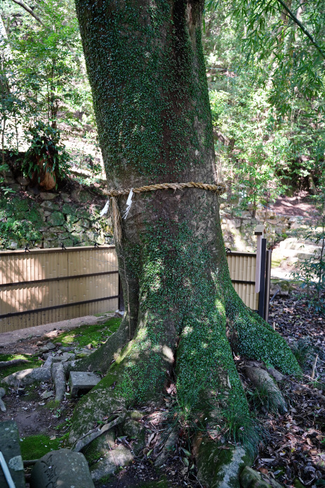 | ●【オガタマノキ】 一部が竹柵で囲われています。 幹周実測値/3. 00m。 | |