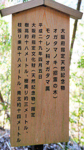 | ● | 指定 : 大阪府指定天然記念物 (ナギ:H15年1月31日指定) (オガタマノキ:H29年4月5日指定) |