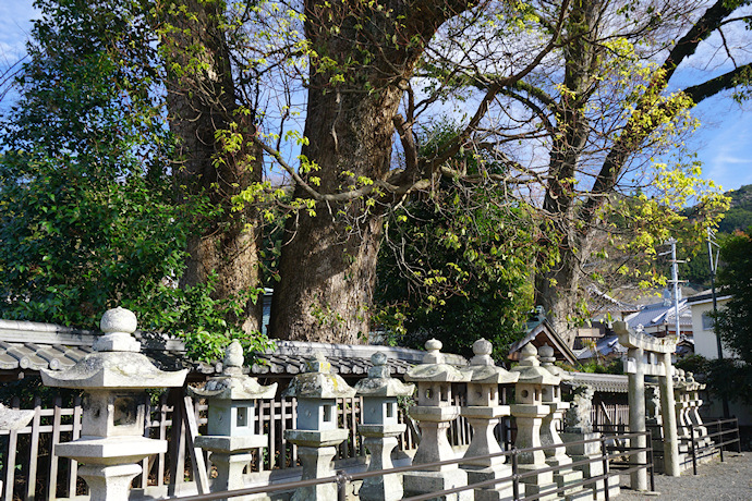 | ●環境省巨樹巨木林DBによれば、クスノキは幹周/7.50m、主幹幹周/3.90m。樹高は目視で約20m。 | |