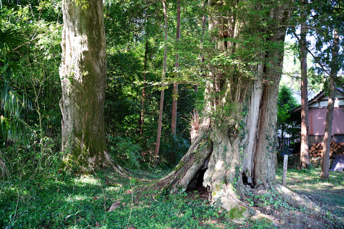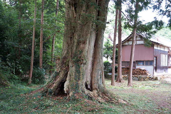カヤノキは社殿南側の社叢の中にあり、林の中ではひときわ大きな巨樹ですからすぐに分かります。「カヤ 樹齢推定700年」の札がかかっていました。地上2mほどで二股に分かれていますが、根元に腐朽による空洞が見られます。