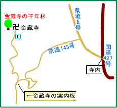 | ● | 県道8号から県道143号に入り県道を登っていくと「←金蔵寺」の案内板があります。案内板のある三叉路を北に折れると舗装されていますが細い坂道を1km程行くと右手に駐車場があります。車を置き200m程徒歩で登ると金蔵寺に着きました。 金蔵寺は高野山真言宗の寺院で本尊は薬師如来。役行者の開山になり、その後奈良時代の天平2年(720年)に僧行基が来山し、自ら等身大の仏像を刻み、その胸に黄金仏を安置して本尊とし、本堂を建立された。その後、天台宗の慈覚大師が来山、再興されたこともあり、奥の院には役行者・行基菩薩・慈覚大師の銅像が建てられています。 樹齢千年杉と呼ばれている大杉は本堂の手前にそびえており、樹高の下半分には枝がなく、非常にすっきりとした樹冠をしています。ちょうど本堂は修復中でしたが、お寺の奥様にお話を聞くことができました。 (HP管理者) |