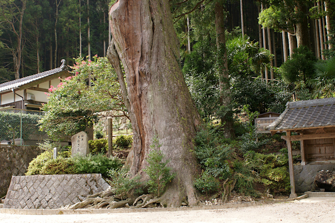 大杉は樹勢回復のために兵庫県樹木医会の治療を受けており、不定根を根元まで誘導し新たな活力を導く努力がなされています。大杉が弱り始めたのは昭和29年の台風29号(洞爺丸台風とも呼ばれます)により南側に張り出していた大枝が裂けたことにより始まるとされます。県下第2位の大杉であり、是非とも樹勢が回復して欲しいものです。