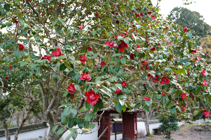 | ● | 西林寺は高野山真言宗の寺院で、山号は栢谷山(かやだにさん)といいます。白雉(はくち)2年(651年)法道仙人によって開基されたと伝わる古刹で、平安時代中期に天台宗・恵心僧都により中興された観音霊場です。 県の天然記念物に指定されている「唐子ツバキ」は、本堂手前の「西脇聖天堂」の境内にあり、真っ赤な大きな花をたくさん付けていました。樹下にも花が落ちており、若干見頃は過ぎていたようです。 「唐子ツバキ」とは、濃紅色一重でおしべが八重になって盛り上がるように咲く非常に珍しいツバキです。この花の咲く様子は、唐子人形の髪を結った形に似ていることから「唐子咲き」とよばれています。西林寺の唐子ツバキは樹齢200年以上とされる大木です。 ツバキは種類が多く、色・形・咲き方・大きさなどで3000種類もあるといわれています。また西林寺はアジサイ寺としても親しまれています。この付近は「都麻里」(つまのさと)と呼ばれており、播磨国風土記にも出てくるようです。 (HP管理者) |