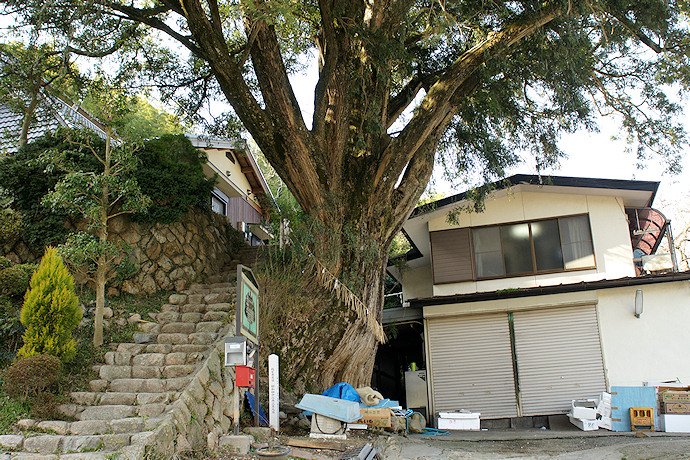 | ●急な崖に生育しており、しめ縄が張られています。この家の方が張っておられるそうです。 |