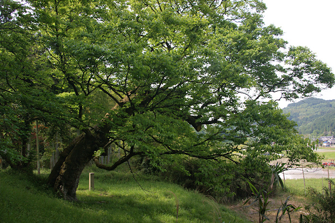 | ● | 車で新宮方面から進むと、志文川に架かる橋の欄干に「弓の木」の看板がありますので、左折して橋を渡り、すぐにJR姫新線の踏切を渡ります。未舗装の道を姫新線に沿うように進むと獣よけの柵に突き当たります。付近に車を停め、扉を開けて入り進むと50mほどで弓の木に到着です。左は墓地で、弓の木の前にも石仏があります。 「弓の木」の名称は鎌倉時代初め、後鳥羽上皇が「承久の変」で敗れ隠岐の島に移されるとき、この木に弓をかけて休まれた伝説から来ています。元は2本のムクノキが株元で合着していましたが、明治の末頃に1本が風で倒れ残った片方が今の「弓の木」です。 「弓の木」の名前は、弓のように反った幹の形状にあったのかと思っていたら、実は日本史の有名な事件「承久の変」が名の起こりとは。近くには日本一のムクノキの「三日月の大ムク」や「下本郷の大ムク」もあります。 (HP管理者) |