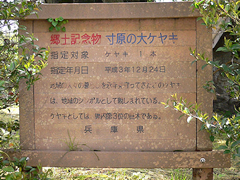 | ● | ネット情報によれば、平成16年に樹勢再生への手だてを講じるものの樹勢の衰微が著しく、地元の住民だけではなく多くの参加を得て樹勢回復のため土壌の改良、ロープ柵の設置、竹葺き屋根の設置を行っています。 地域のシンボルとして大切にされてきた大ケヤキです。書籍「ひょうごの巨樹・巨木100選」には、この大ケヤキは旧家の屋敷跡にあったものとありました。樹名の「寸原」(ずんばら)とはこのお屋敷の屋号だそうです。 残念ながらこの「ひょうごの巨樹・巨木100選」には選ばれていませんが、幹周8.5m(100選では幹周7.8m)はケヤキとしては県下第3位ということになります。 (HP管理者) |