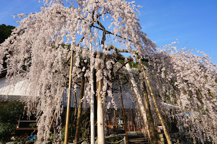 | ● | 宝蔵寺は曹洞宗の寺院で、境内には明治維新の先駆けとして知られる天誅組の義士・池田謙治郎の墓があります。境内には村の天然記念物に指定されている枝垂れ桜と、この桜の二世桜があります。訪問したときは午後4時を過ぎていましたが、満開で快晴という絶好の機会に巡り会えました。 平成23年に立てられた説明板では、NHK-BSプレミアムの「秀吉の愛した桜−醍醐の花見物語」で新たな発見が放送されました。それは醍醐の花見をするために近江・山城・大和・河内から700本の桜を取り寄せたと記録にあります。近畿各地の樹齢200年以上の桜のDNAを調べたところ、醍醐寺の枝垂れ桜と宝蔵寺の枝垂れ桜が遺伝的に近いことが判明したそうです。宝蔵寺から運ばれた枝垂れ桜の子孫が醍醐寺で今も生きている可能性が高いそうです。 (HP管理者) |