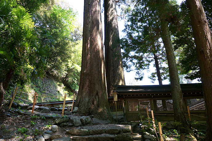 | ●下から見ると非常に近接していますが、なぜか2本の杉の間には本殿の塀があります。 |