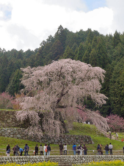 | ●今年も少し遅くなって満開になった又兵衛桜。大勢の人とカメラに囲まれて咲き誇ります。幹周/3m、樹高/13m。 |