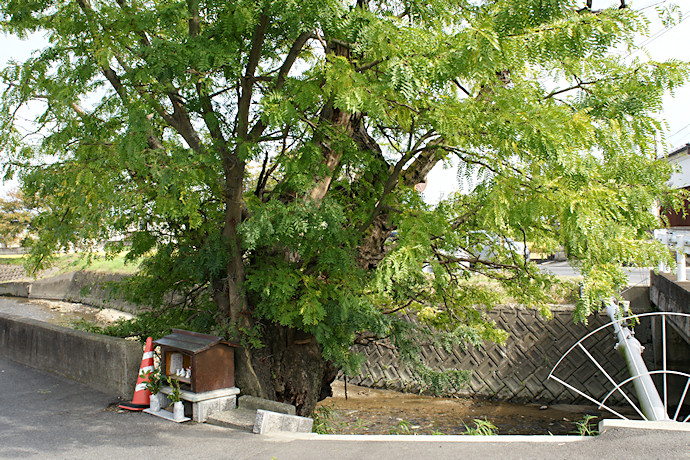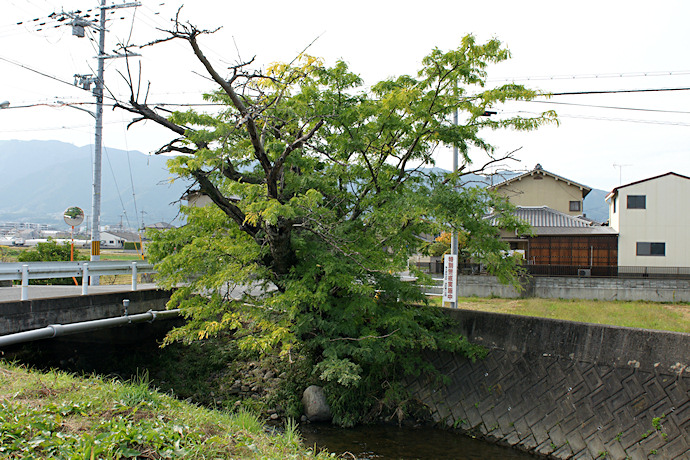 | ● | 国道166号線の「曽大根」交差点を東に入り、JR和歌山線の踏切を渡り右に折れ、さらに左折れると甘田川に架かる橋に出ます。その橋のたもとに「曽大根のサイカチ」があります。道路を挟んで白龍大明神の社があるので、「白龍大明神のサイカチ」とも呼ばれます。サイカチの由緒を記した説明板があるのですが、退色のためにほとんど読めません。(最近書き直されました) ネットで探すと、「昔、村人が作物の苗を担いで橋を渡っていたら、小蛇がいたので、カゴで除けようとすると、大蛇になって襲いかかって来ました。驚いて家へ逃げ帰ると、その夜から高熱を出して臥したとかで、ここに『白龍大明神』を祀りました。自来村人はこの木を霊木として恐れ、その傍らに白龍大明神を祀って神慮をなぐさめている。」とあります。また、「さいかち娘」という民話も紹介されていました。 サイカチは甘田川の堤防にあり、幹からはサイカチの特徴である鋭い針のようなトゲがあります。腐朽したところもありますが、まだまだ葉をいっぱい茂らせていました。 (HP管理者) |
