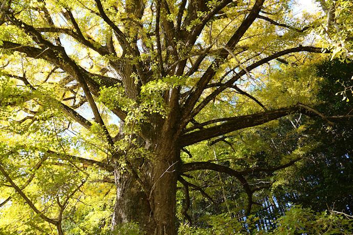 「来迎院の大イチョウ」とも呼ばれており、地元では天河弁財天社を詣でた弘法大師のお手植とされています。説明板には、大峰山信仰や多数の能関係の資料で知られる天河弁財天社の西に位置し、これほどの樹勢の良い巨樹になったのも、神社や寺内の信仰の地にあったので切られずに残ったものとあります。