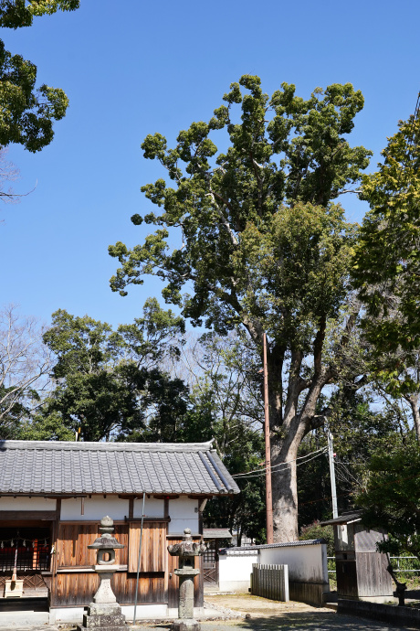 | ● | 天正13年(1585年)の豊臣秀吉の根来攻めの際、周辺の寺社と共に灰燼に帰し、書等は一つも存在していないため創建時期などの由緒は不明。しかし延喜式神名帳にも記載されている由緒ある神社です。祭神は天疎向津姫命、神功皇后など。 本殿は寛永元年(1624年)に再建されたもので、平成7年(1995年)に和歌山県指定文化財になっています。クスノキは本殿を囲む白塀の外にあります。幹周5mを超える巨樹ですが、樹冠の広がりがあまりないので大きさを感じないのが残念です。枝を切られているようでもないので、このような樹形なのでしょう。 (HP管理者) |