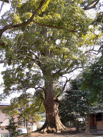 | ●本殿前の「三代重ね石」背後の大楠です。環境省巨樹巨木林DBでは、幹周/8. 85m、樹高/15m。 |