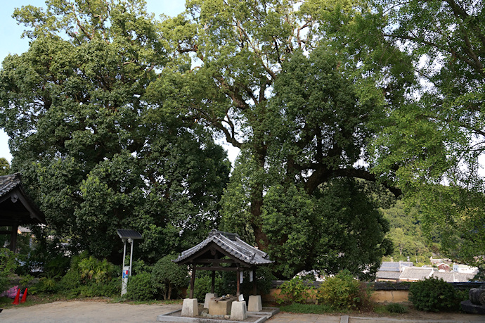 | ●境内から見たクスノキ。左右に2本あります。樹齢は600年といわれています。 | |