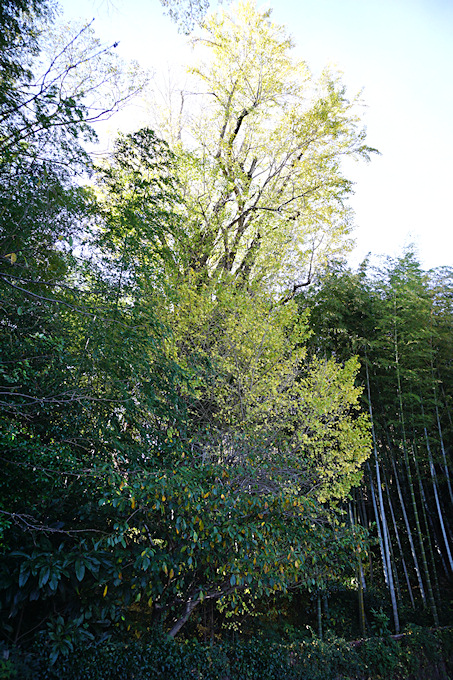 | ● | 高山寺は聖徳太子の開創、弘法大師の中興と伝えられる真言宗御室派の古刹。「田辺の弘法さん」の名で市民に親しまれています。会津川の河畔の丘陵地にあり、境内には縄文早期の高山寺貝塚があります。広い境内には多宝塔をはじめ諸堂が整い、非常に行き届いた整備がされており、秋の日の散策にはもってこいの環境でした。 また、日本の自然保護運動の先駆者である博物学者・南方熊楠の菩提寺が、この高山寺です。イチョウよりも熊楠さんのお墓参りを先にさせていただきました。 高山寺で有名なのが多宝塔です。多宝塔とは二重屋根の高塔で、高野山の金剛峯寺の根本大塔のように真言宗寺院の中心となる建造物です。一般には大日如来をお祀りしていますが、高山寺では聖徳太子を祀り、その名も上宮閣というそうです。 イチョウの木はお寺の東口、国道に面した駐車場への登り口にあり、根元がひこばえや生け垣に邪魔をされて、はっきりと写すことができません。ちょうど黄葉の時期でしたが、余り枝葉も多くない感じでした。山門を出ると「切戸橋際のクスノキ」があります。 (HP管理者) |