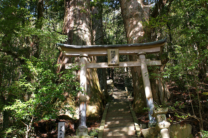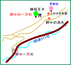 | ● | 野中の一方杉は熊野古道・継桜(つぎざくら)王子社にあり県の史跡及び天然記念物に指定されています。ここは熊野古道観光の中心地といってもよい地域で、すぐ隣に茅葺き屋根の「とがの木茶屋」があり、その向こうには「秀衡桜」があります。 「一方杉」と呼ばれるのは、杉のすべてが熊野那智大社のある方向(南)にだけ枝を伸ばしているためです。日射しや地形の関係で、一方向にだけ杉が枝を伸ばしたということなのでしょうけれど。 神社合祀前には40本ほどあった野中の一方杉ですが、現在は8本を残すのみです。合祀といえば、この王子は若一王子権現ともいわれ、野中の氏神になっていました。明治42年の神社合祀令で近野神社に合祀されましたが、 社殿はそのまま残され、戦後になってご神体を戻し、復社を果たしました。 この一方杉が残ったのは南方熊楠が合祀令に反対し、寺社林の保存を必死に訴え、何とか8本が残りました。現在大杉と呼べるのは4本でしょうか。継桜王子の下の道には「野中の清水」があります。 「継桜」の名は、天仁2年(1109年)藤原宗忠が熊野に参詣した際、日記(中右記)に桧の株に桜が生えていて、まことに希有なことだと記されており、その後建仁元年(1201年)後鳥羽上皇に随行した藤原定家の日記には「継桜」王子とあります。 この「継桜」は、後世、滝尻王子のそばに子を残してきた奥州の藤原秀衡が、我が子の無事を祈念して、桜の枝を折って刺したものが根付いたと伝えられるようになり、「秀衡桜」の名で呼ばれるようになりました。詳しくは「みくまのネット」で。 近くには「福定のイチョウ」、「高原熊野神社の大楠」があります。 (HP管理者) |