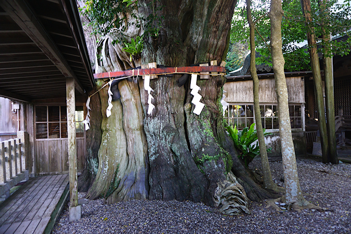 | ●境内の説明板によれば、幹周/7. 46m、根元周/10. 7m,,樹高/19.0m、推定樹齢/1200年。 |