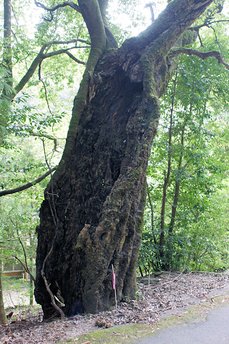 国道370号線から惣福寺に向けて山道を登っていくと熊野神社への石段前にこのしらかしの老大樹群があります。説明板にもあるように5本あったのですが、ほとんど枯れてしまって、今では2号樹のみが何とか巨樹という原形をとどめています。