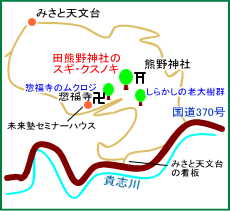 | ● | アクセス : 【車】阪和道・海南東ICから国道370号線を東に約25km。美里温泉を過ぎて「みさと天文台」の大きな看板のある分岐を大きく左に折れ、天文台方面に上る。途中に惣福寺の案内板があります。熊野神社は惣福寺の隣り。 | |