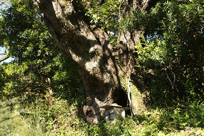 | ● | 新しく開通した紀勢道のすさみICから北にすぐの所に沼田大師堂の「ウバメガシの老大樹」があります。道が細いので、川を渡る手前で駐車して大師堂へ歩きました。石段を登るとすぐ右手にウバメガシの大樹があり、登り切ると「沼田大師堂」と書かれた真新しいお堂があります。 このウバメガシの老大樹は、県下最大のウバメガシといわれ、生育状態も良さそうで、樹勢も旺盛な老大樹です。老大樹というにはまだまだ早そうな気もしますが。「日本風景街道 熊野」を参考に名前をつけました。 ウバメガシは紀州備長炭の原木として有名で、ブナ科コナラ属の常緑広葉樹で比較的痩せた急斜面の崖地などに生育しており、南紀には普通に生育しています。このHPでも白浜町の「子安地蔵のウバメガシ」、「御崎神社のウバメガシ」を紹介しています。 (HP管理者) |