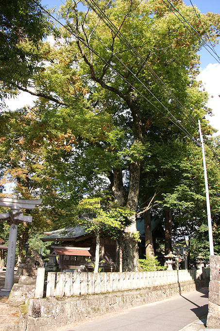 | ●環境省巨樹巨木林DBによれば、幹周/5. 80m、樹高/30m。拝殿右が大ケヤキです。 | |