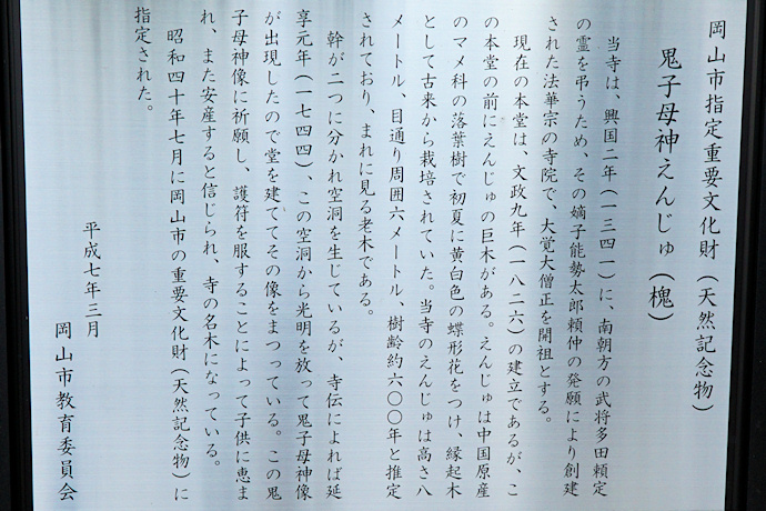 | ●「鬼子母神えんじゅ(槐)」の説明板。 |