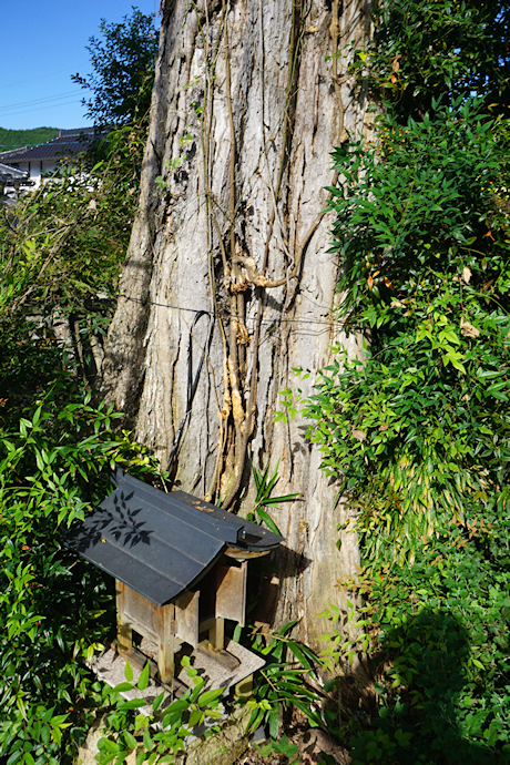 | ● | 国道374号線沿いのお宅の裏庭にあるムクノキです。写真を撮りたいとの断りを入れてから撮影に掛かりました。ちょうど枝の剪定のためでしょうかはしごが幹に架けられていました。 幹周は4mほどですが根元には小祠が祀られており、大事にされているようです。ツタがかなり上の方まで伸びており、ムクノキの葉の具合がわかりにくいようです。 (HP管理者) |