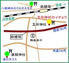 | ● | アクセス : JR徳島線・麻植塚(おえづか)駅から南東に300m。 【車】国道192号「麻植塚」交差点から東に1.2km、大きく左折し600m。道路脇に駐車スペースあり。 | |