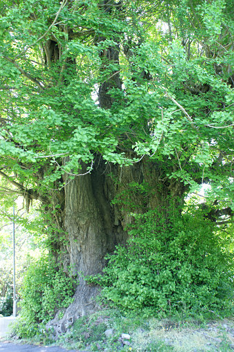 | ● | 「中山路のイチョウ」は、郡里廃寺跡(こうざとはいじあと:国史跡)の中心部にあり、幹周が約12mというイチョウの巨樹です。樹齢は約700年といわれています。数十年前に主幹が伐採されてしまいましたが、かっては32m程の樹高があったそうです。この銀杏は雌の木で、秋には大量のギンナンの実をつけます。雌の木としては全国でも屈指の規模を誇ります。 「郡里廃寺」は今から約1300年前の白鳳時代に建てられた徳島県で最も古い寺院跡で、昭和51年に国の史跡に指定されました。金堂、塔、南大門など七塔伽藍を備えた法隆寺並みの大寺院であった事が分かりました。そのときにはこの大イチョウはまだなかったのでしょうが。 加茂の大クスの次に訪問したので印象が薄くなりがちですが、改めて写真を見るとその幹の雄大さに驚きです。 (HP管理者) |