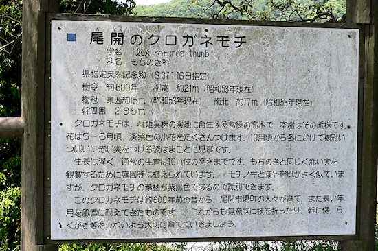 | ● | クロガネモチは関東以西に分布するモチノキ科の雌雄異株の常緑高木で、雌木は秋になると真っ赤な実を一面に付けます。この「尾開(おばり)のクロガネモチ」は雌木です。クロガネモチは成長が遅く、せいぜい樹高も10mぐらいにしか育ちませんが、この木は市場町尾開の人が育て、長い風雪に耐えてきたと説明板にありました。 「野神の大センダン」から北東に走り、上喜来橋から北に折れて、尾開の周辺をぐるぐる車で回りましたが、なかなかこのクロガネモチが見つからず、半ばあきらめかけていたときに偶然それらしき樹を見つけました。 写真を撮影中、通りかかった近所の方が「徳島でこんな大きなクロガネモチの木はないよ」と誇らしげに話してくれました。 (HP管理者) |