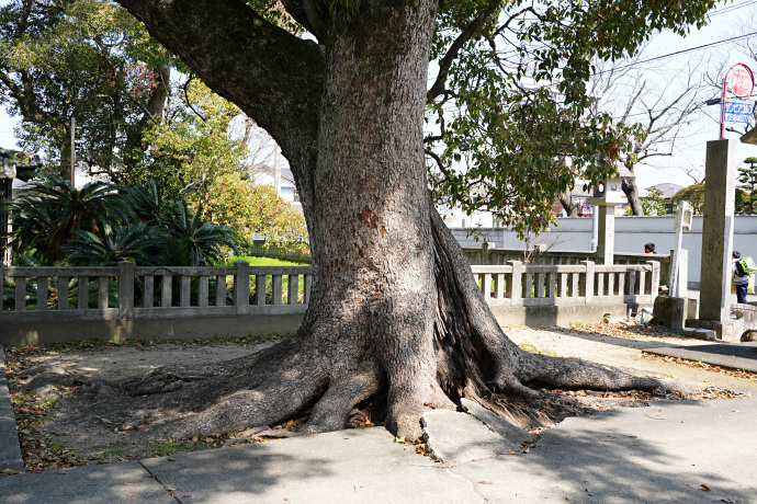 | ●境内を被うほどに広がったクスノキ。地上2mほどで三幹に分岐しています。 | |