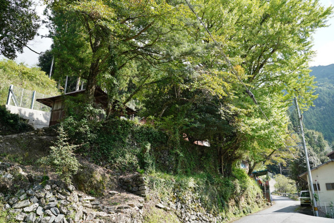 | ● | 吉野川沿いを走る国道32号線を大歩危駅の前で北に折れかずら橋方面に向かい2km余り、左折すると西祖谷中学校があります。その道路を挟んだ向かい側の崖に「千年寺跡のイチョウ」がありました。説明板などはなく、千年寺の説明はありません。 イチョウはひこばえが多く、崖にあることから幹周実測はできませんでした。それでも環境省巨樹巨木林DBでは幹周/7.6mというからかなりの巨樹です。「阿波のごっつい木」(サイトは無くなりました)によれば、樹齢約800年とのこと。 石段を登ると平坦な高台に出ます。小さなお堂が一つありました。木札に名称が書かれているようですが、消えていて読めませんでした。 (HP管理者) |