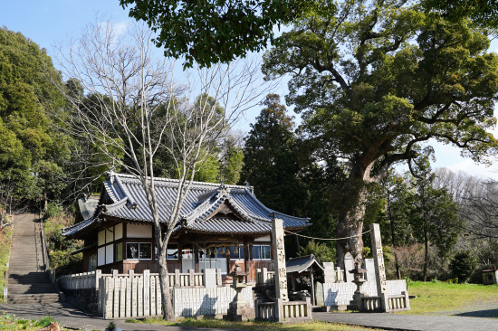 | ●社殿横のクスノキで、環境省巨樹巨木林DBによれば、幹周/5. 40m、樹高/25m。 幹周実測値/5. 76m。 | |