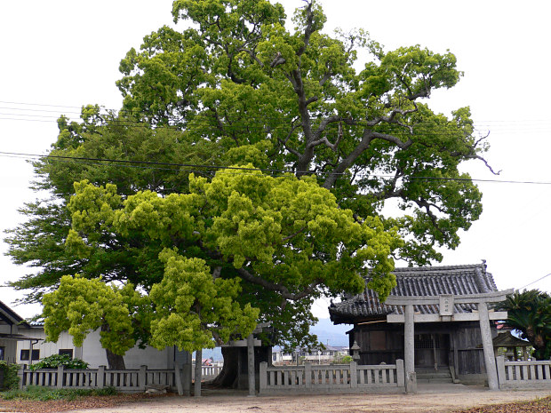 | ● | 「敷地八坂神社境内大クス」として町天然記念物の指定を受けています。藍住町はその地名の通り「藍染め」の町として有名です。 幹周7mを超える大木ですが、大きな特長がないためかウエブ上にもほとんど画像は見あたりません。さほど大きくない敷地八坂神社の境内を1本でほぼ独占しており、幹線道路からも少し外れていて静かな環境です。 (2017/9/14追記)最近グーグルのストリートビューを見ていたら、大枝が切られており樹冠が随分寂しくなっていました。 (HP管理者) |