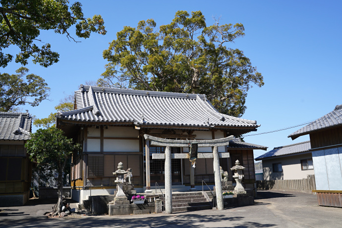 | ● | 下大野八幡神社の主祭神は誉田別命(ほんだわけのみこと=応神天皇)です。神社は那賀川の右岸から600mほどの所にあり、周囲は田畑が広がります。 由緒として、創立年代不詳とのこと。『阿波誌』に「八幡祠下大野芝根里に在り」と。また、『寛保帳』に「下大野村 八幡宮 別当下大野村 神応院」とあるそうです。確かに八幡神社の北隣には神応院という寺院があります。明治以前の神仏習合時代は神宮寺だったのでしょう。 クスノキは拝殿の右手後ろにあり、幹周は5mほどです。この程度のクスノキでは天然記念物にならないのが徳島巨樹王国のすごいところです。境内には他にもシイの木の古木がありました。 近くには「中大野町のクスノキ」があります。 (HP管理者) |