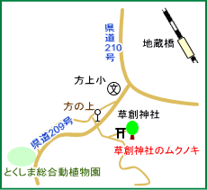 | ● | 草創と書いて「そうぞう」と呼びます。かっては「惣蔵権現」と呼ばれていたそうです。現地に説明板がなく、ネットの情報もほとんどないので、創始などについては不明です。 ムクノキは本殿裏にあり、大きな板根が特徴です。ムクノキには板根を持ったものが多いのですが、このムクノキの板根は非常に立派です。境内には徳島市の保存樹木に指定されているイチョウがありますが、ムクノキの方が大きいのになぜか指定されていません。 (HP管理者) |