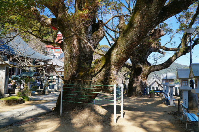 薬王寺には2本の大クスがあり、5.53mと4.44mのデータが登録されています。2幹に分岐している方が太いようです。日和佐の町が一望できる場所に大クスは立っており、樹下にはベンチがもうけられていました。