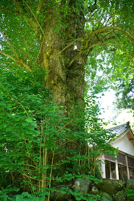 | ●【イチョウ】 現地説明板によれば、幹周/5. 2m、根回り/7. 0m、樹高/40.0m、樹齢/400年。 | |