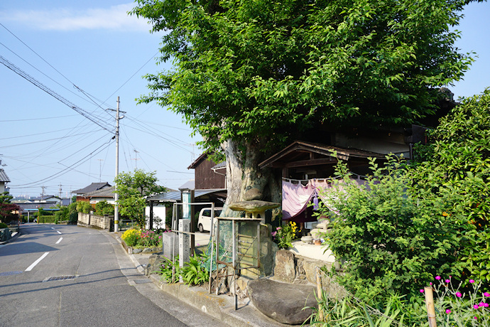 | ●ムクノキの前の石柱には、「西条市の名水・名木50選」と記されています。 | |